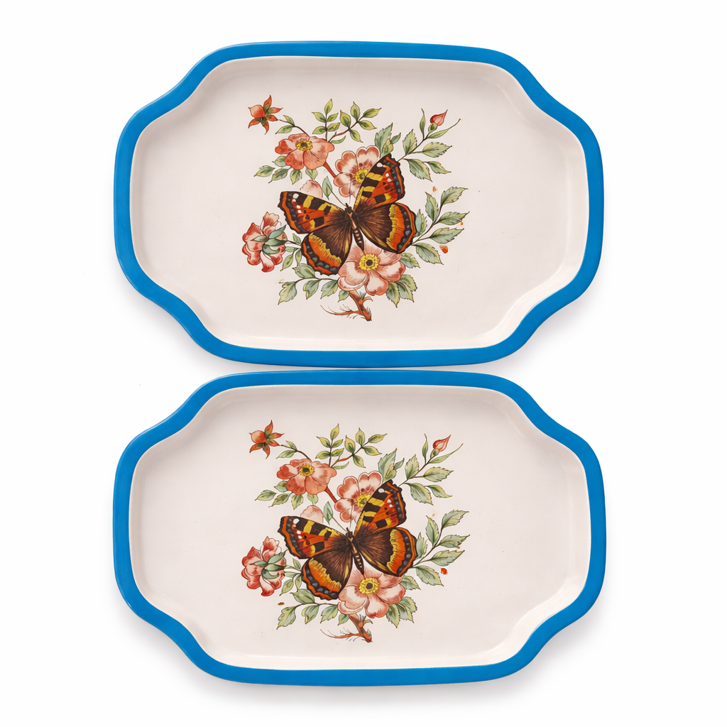 Add a touch of timeless charm to your home with this beautiful set of two vintage butterfly floral trays. Featuring a richly detailed butterfly surrounded by blooming florals, these trays are framed with a vibrant blue scalloped edge that gives them a classic yet cheerful cottage-core feel.